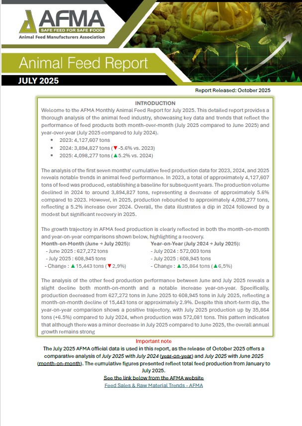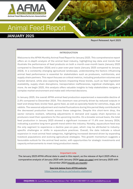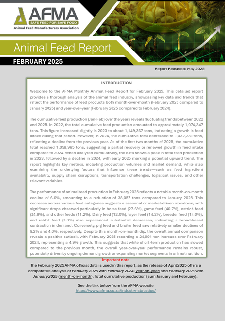 AFMA’s Monthly Animal Feed Report provides a concise yet comprehensive overview of feed production trends across South Africa. Based on monthly submissions by feed manufacturers, this report tracks the volumes of different feed types produced for various sectors, including poultry, dairy, beef, and swine.