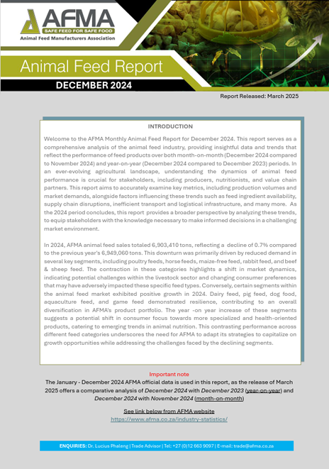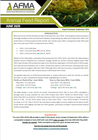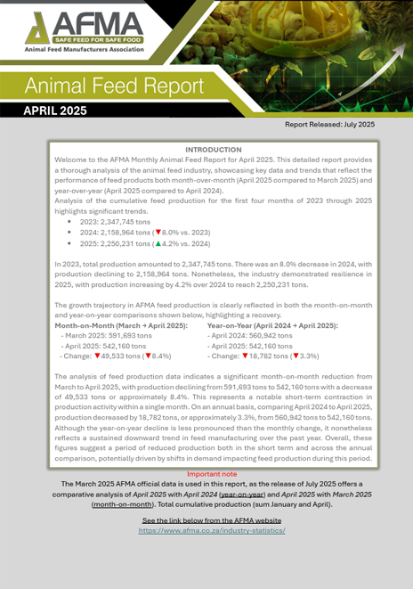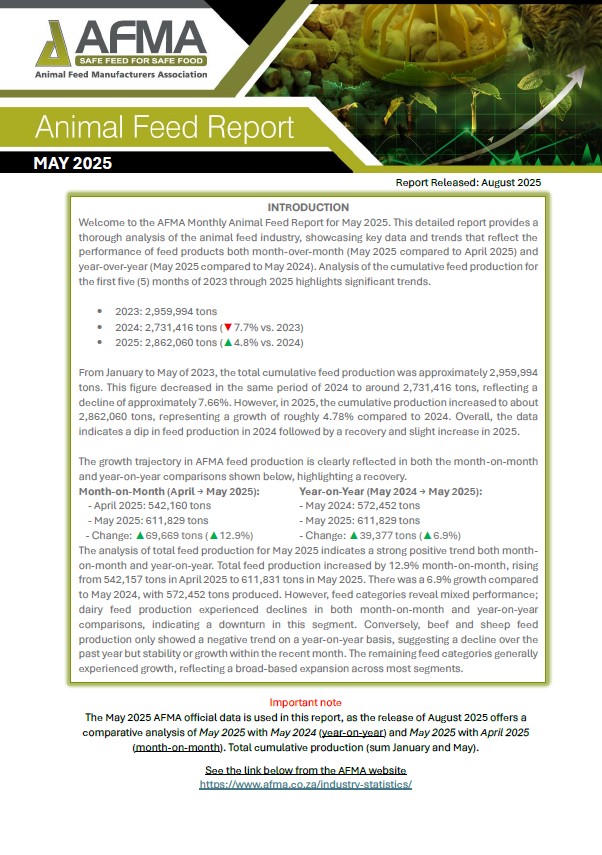 *AFMA feed production data is published with a three-month delay in compliance with the Competition Commission’s recommendation. This ensures aggregated statistics are released only once a quarter has passed, safeguarding fair competition and equal access to information.*